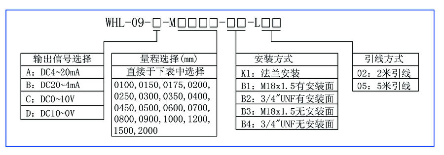 n 线性量程:0~2000mm可选(详见订货指南,亦可根据用户要求定制)。