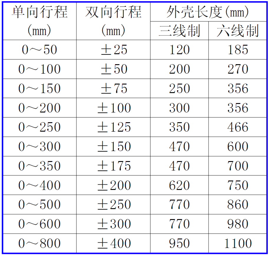 传感器行程选择:B□□□(参照上述行程表直接填写行程,位数不足时前面补“0”,单位为mm