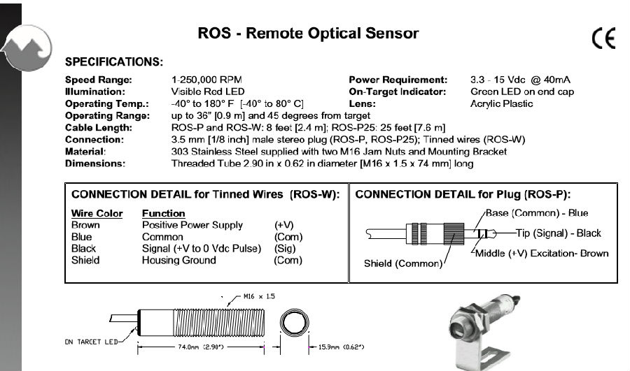 美国蒙那多ROS光电转速传感器,通过在被测物体上贴反光条,利用光电原理来输出标准的TTL转速信号。TTL转速信号可通过转速表显示出转速,也可用于其他工业控制及自动化。